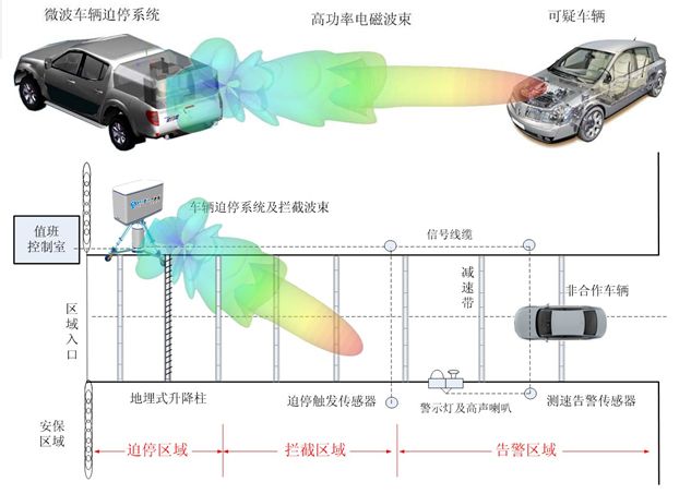 該系統主要由初級電源及控制、高電壓發生器、寬譜脈沖產生器和寬帶陣列天線四部分組成。該系統是專門針對公共區域恐怖犯罪和駕車自殺式襲擊等場合的“反車輛”、“非致命”、“非接觸”的一種高功率微波電子系統,可以在被允許的最小警戒距離外,強迫機動車輛停止并接受檢查。在檢查點或敏感部門布置該系統,天線正對可能的來車方向,當有可疑車輛行駛靠近時,車輛迫停系統按需要輻射高功率微波脈沖,產生的電磁場可在警戒距離外,對車載電子控制燃油噴射(EFI)系統及其核心部件——發動機控制單元(ECU)的正常運行產生明顯的擾亂,噴油量和點火時間異常,導致汽車喪失動力,并且無法轉向,強迫可嫌疑車輛停止并接受檢查,從而達到保護重要目標不受侵害的目的。該系統對駕乘人員和車輛沒有傷害,可在檢查結束后自行驅車離開。 本系統為高功率寬譜電磁脈沖輻射系統,具有能譜密度大、輻射效率高、易于和目標耦合、小型、緊湊,以及安全有效和操作方便等特點。利用高功率寬譜電磁脈沖輻射系統對各種電子學系統進行擾亂和損傷,具有很強的隱蔽性、突然性和多目標性。